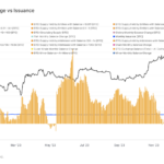 Contrarily, values on the blue line suggest a relatively flat balance for the cohort over a month against issuance, while negative values indicate a reduction in the cohort's aggregate balance, indicating a distribution along with fresh coin issuance. A daily mining rate of approximately 900 BTC translates into a monthly volume of around 27,000 BTC.