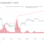 In stark contrast, holders with 100 BTC or less show a distribution trend, affirming the disparity in the accumulation habits of larger and smaller cohorts.