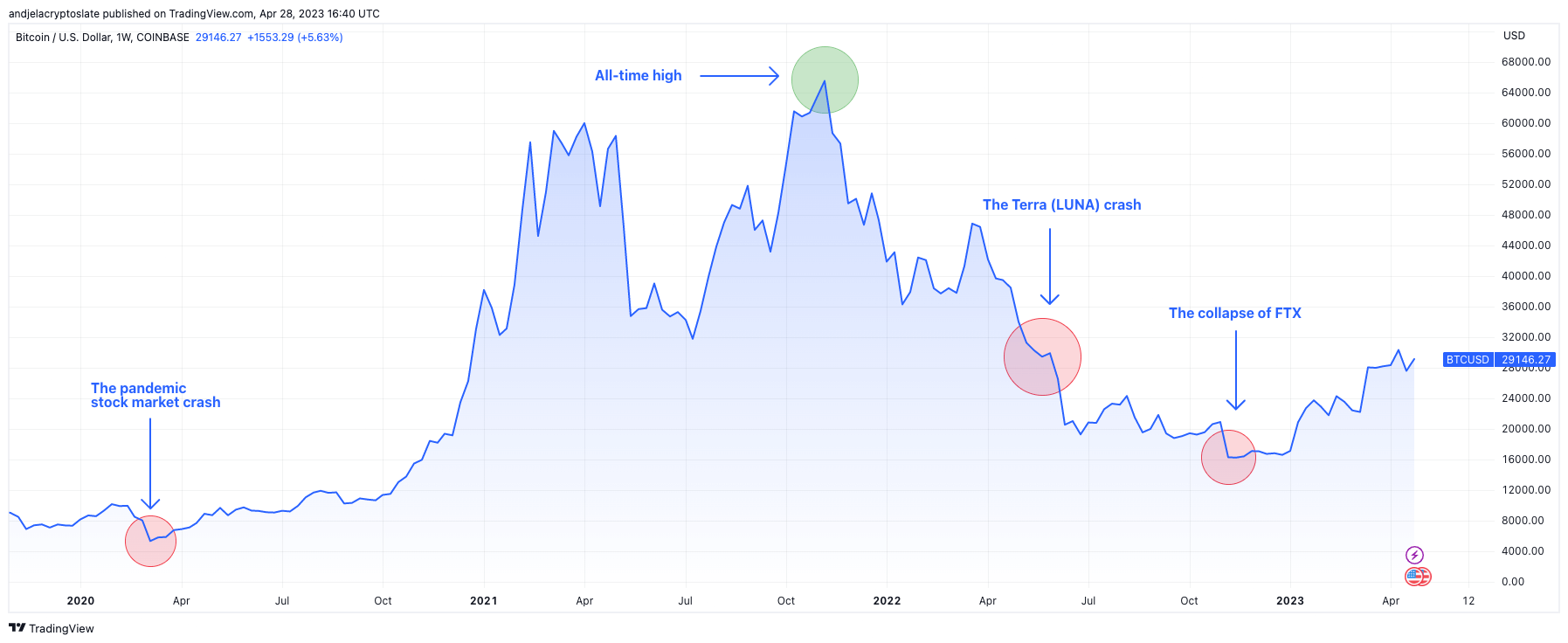But, no matter how bearish these currents are, it seems likely that the market will eventually be able to absorb them. Zooming out shows that Bitcoin quickly recovered from every major setback it faced — from the stock market crash in March 2020 and the collapse of Terra to the crash of FTX.