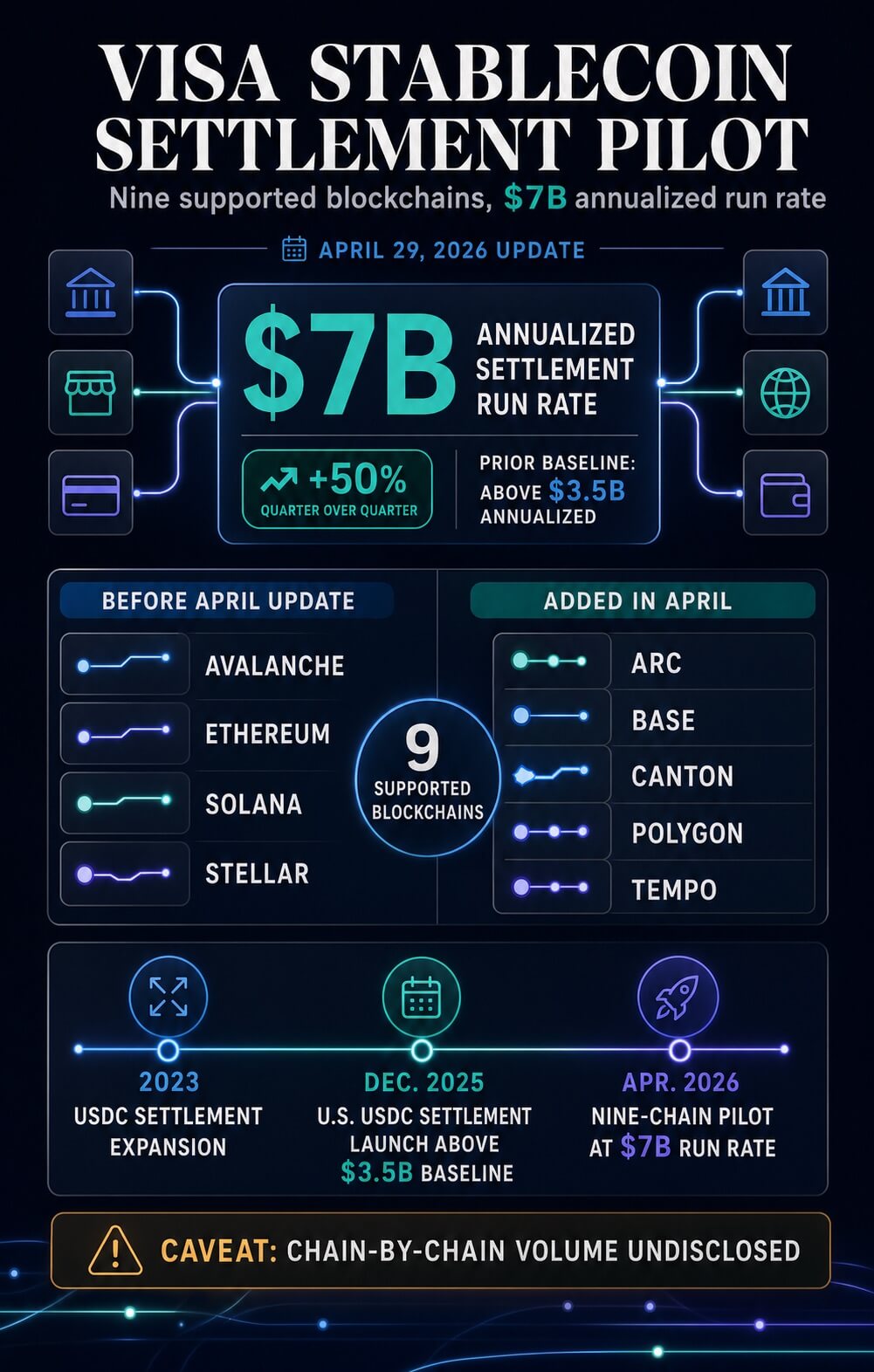 | Avalanche, Ethereum, Solana, Stellar | Arc, Base, Canton, Polygon, Tempo | Visa is widening the settlement pilot across public chains, payment-focused networks and institution-oriented infrastructure. |