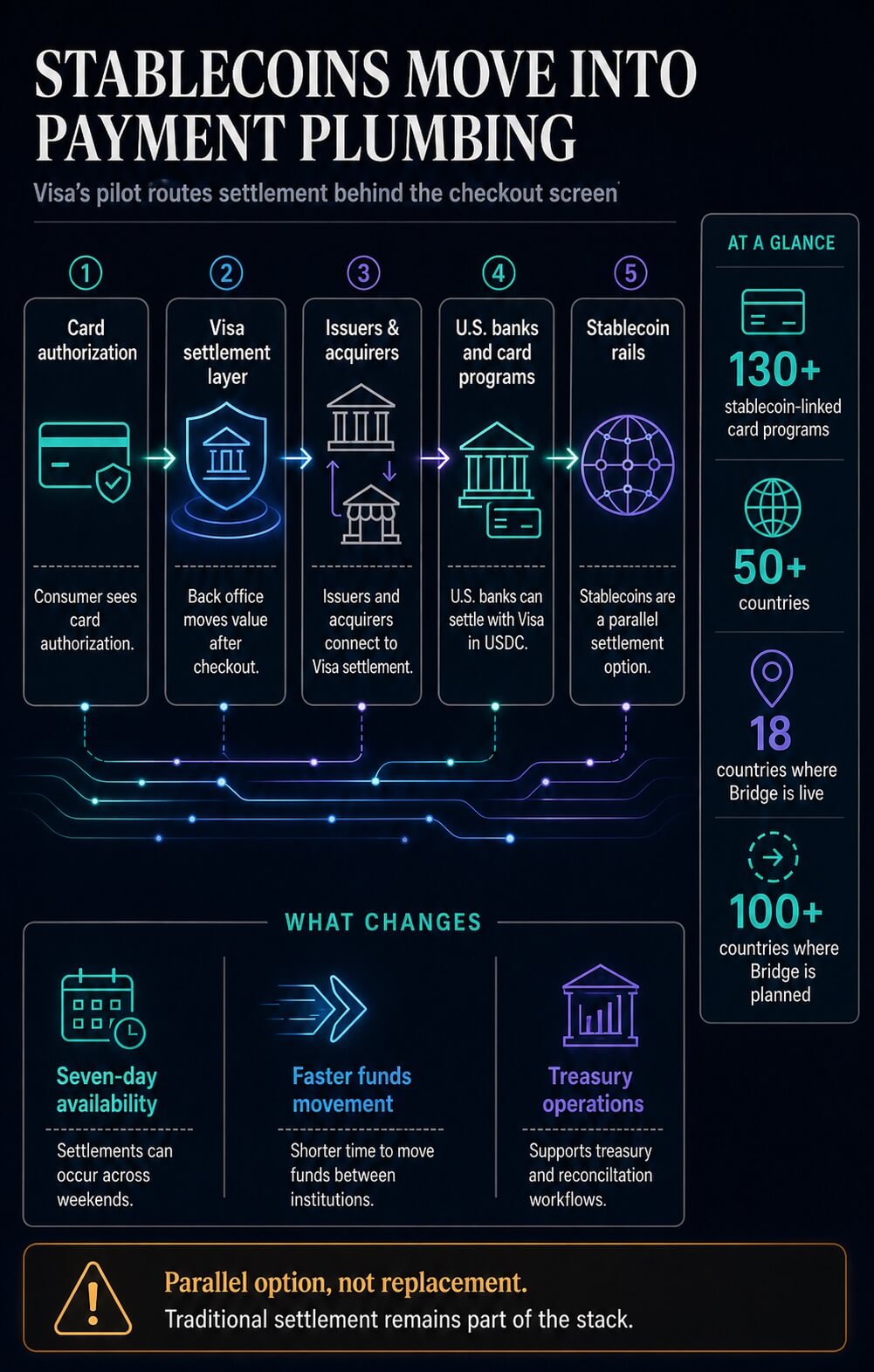 That makes the update a settlement-infrastructure signal as much as a blockchain support list. Visa is testing whether stablecoins can become a parallel settlement option inside payment infrastructure that already touches banks, card programs and merchants across markets.